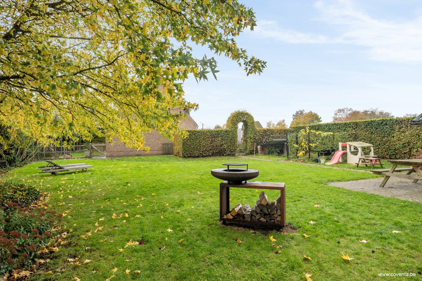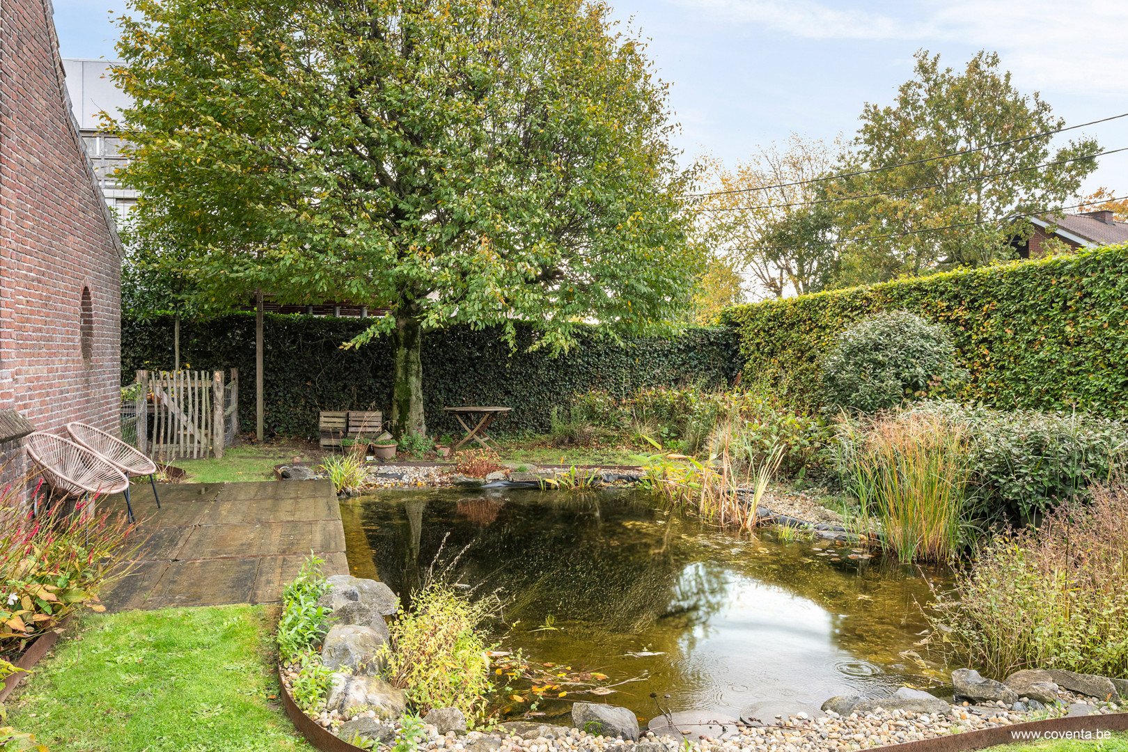 Aangelegde tuin met terras, waterpartij en tuinhuis. Grote oprit.