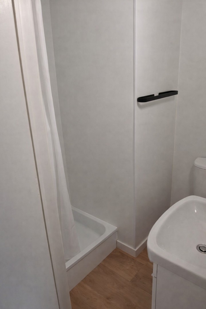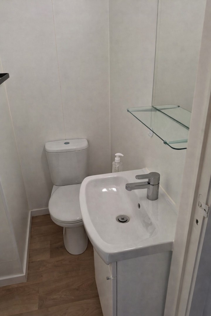 Voorzien van een slaaphoek en een compacte badkamer met douche, toilet en lavabo.