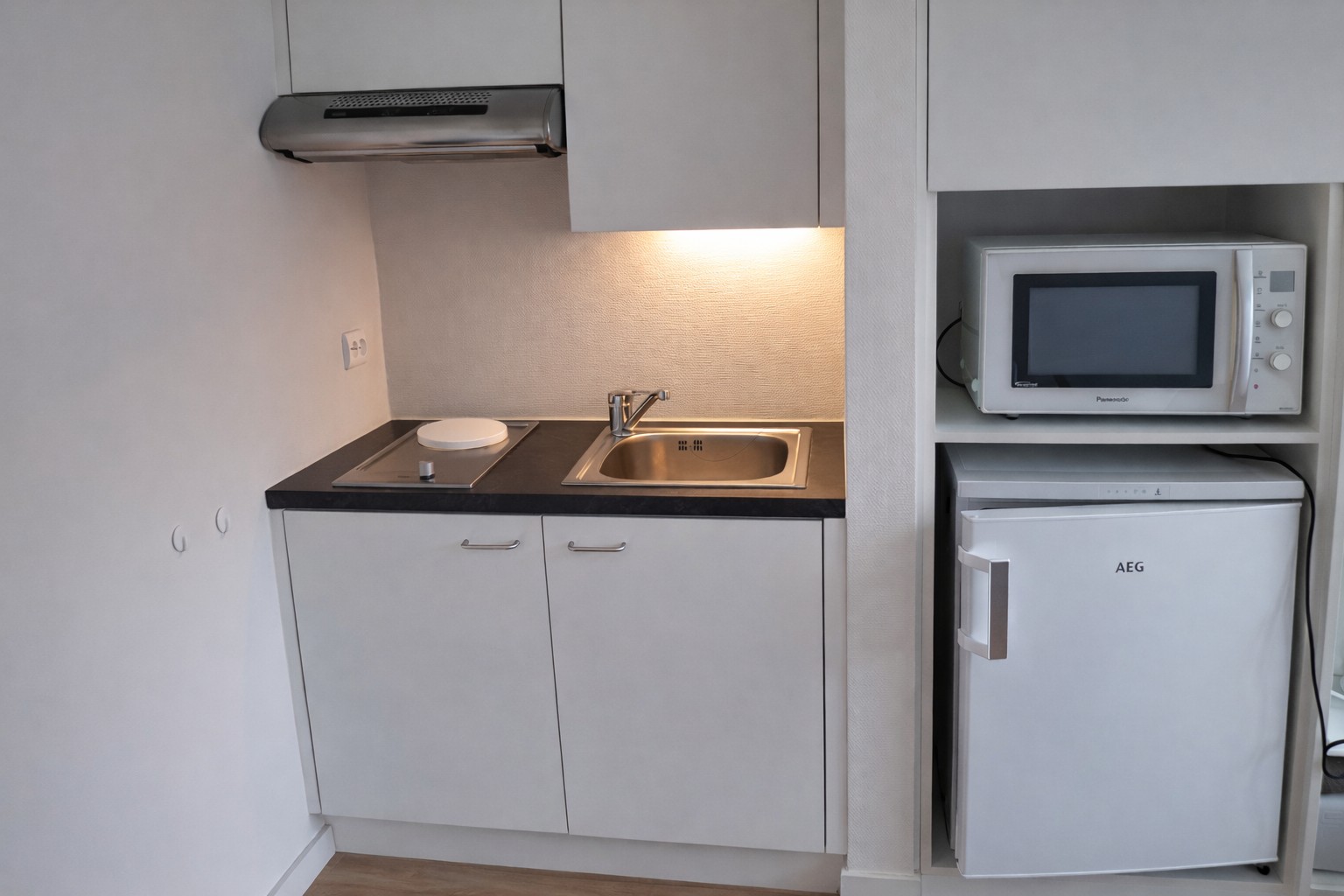 De studio beschikt over een praktische en recent vernieuwde kitchenette met dubbele elektrische kookplaat, nieuwe koelkast, combi oven-microgolf.