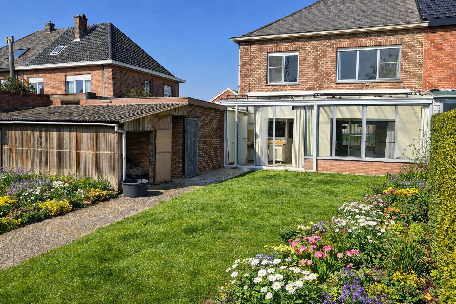 Buiten geniet u van een ruime tuin, ideaal voor gezinnen of tuinliefhebbers, evenals een garage en bijkomende bergruimte.