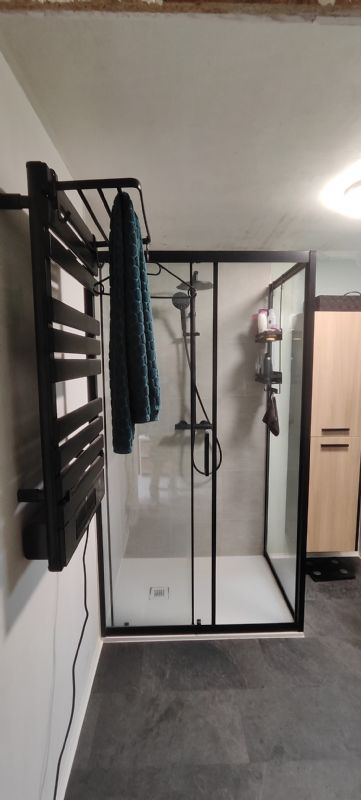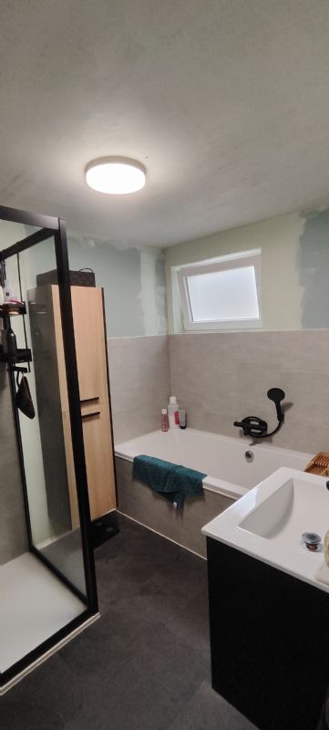 •Badkamer met inloopdouche, ligbad en lavabomeubel