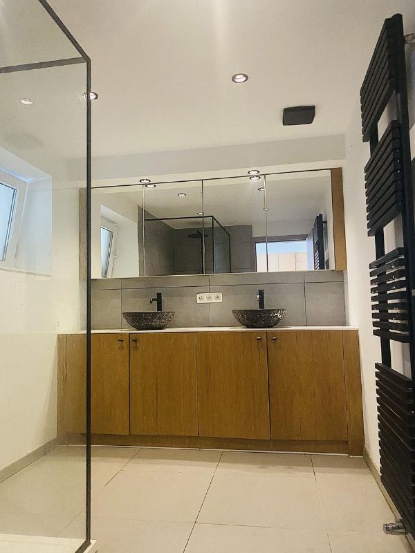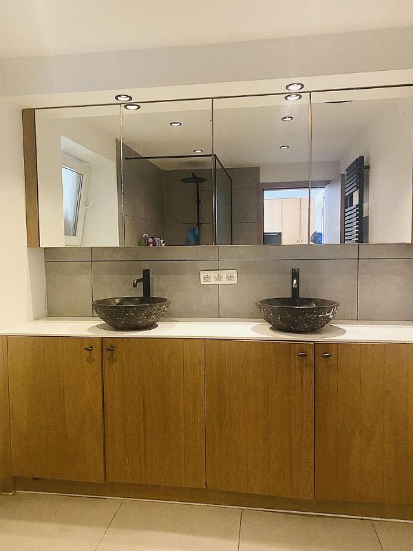 •Stijlvolle badkamer met dubbel lavabomeubel en inloopdouche