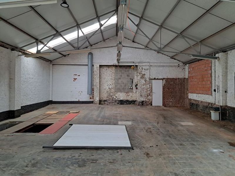 •Grote loods voor opslag, werkplaats en bureauruimte met sanitairen en sectionale poort (dubbele ingang)